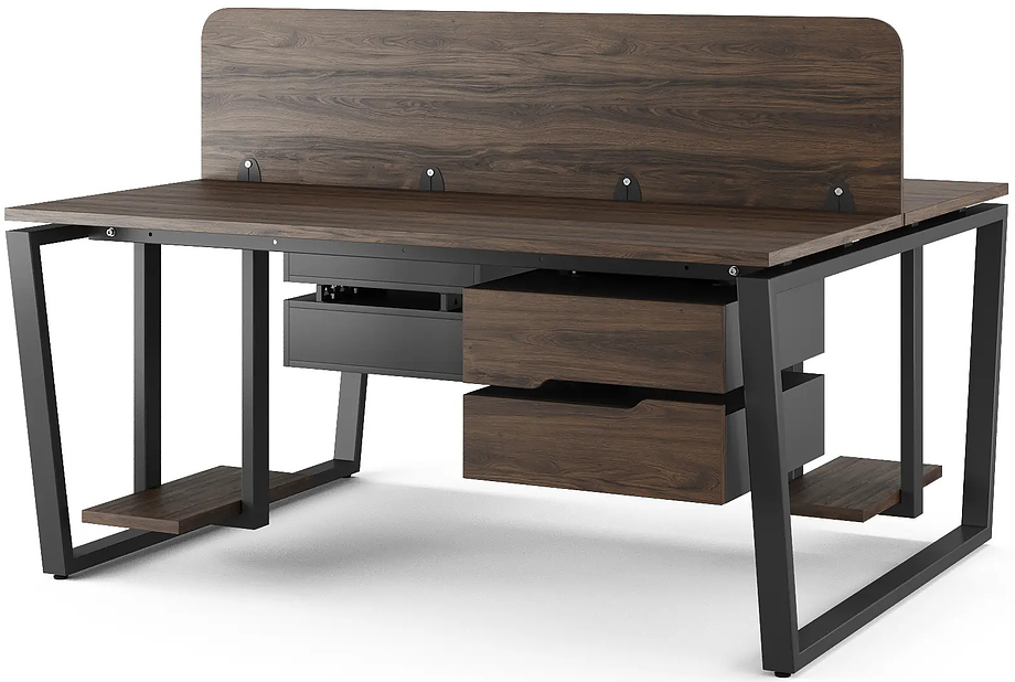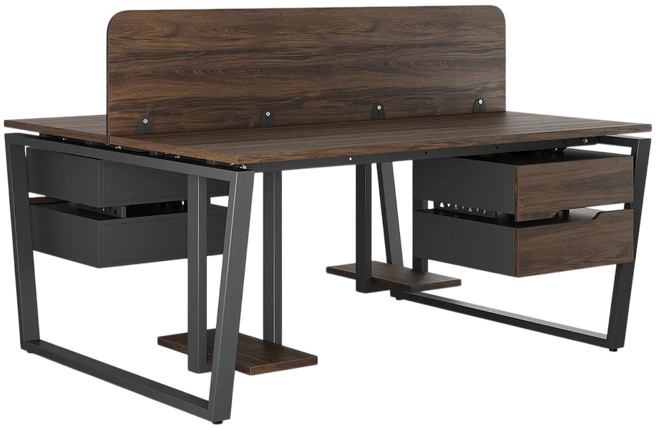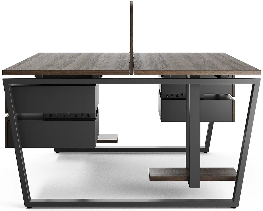 Офисный стол Кобор OTR/2-140/140 black/charlston предназначен для двух рабочих мест и идеально подходит для офисов и кабинетов руководителей. Модель оснащена опорами в виде обратной трапеции. Материал столешницы - прочный ЛДСП толщиной 25 мм, усиленная снизу металлическим каркасом, материал опор и каркаса - окрашенный металл.