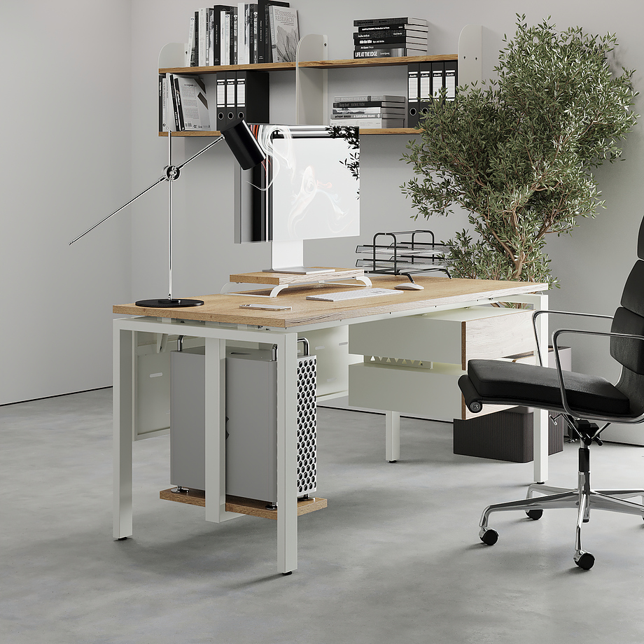 Офисный стол КОБОР P-120/60 white/natural используется в офисных помещениях и кабинетах руководителей. Модель оснащена П-образными опорами. Материал столешницы - прочный ЛДСП толщиной 25 мм, усиленная снизу металлическим каркасом, материал опор и каркаса - окрашенный металл.