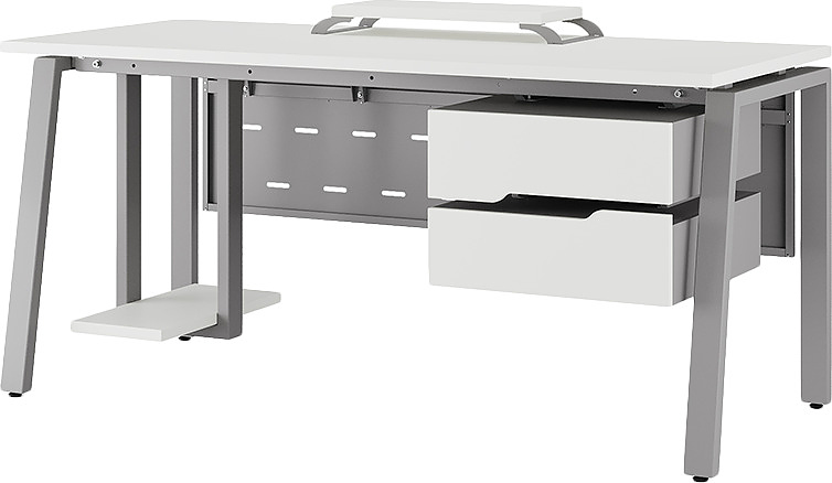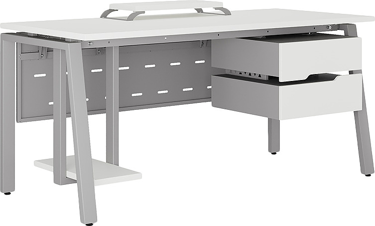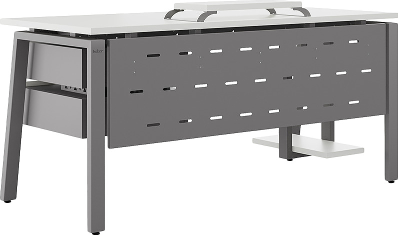 Офисный стол КОБОР AB-120/60 aluminum/premium используется в офисных помещениях и кабинетах руководителей. Модель оснащена A-образными опорами со скошенными фронтальными сегментами. Материал столешницы - прочный ЛДСП толщиной 25 мм, усиленная снизу металлическим каркасом, материал опор и каркаса - окрашенный металл.