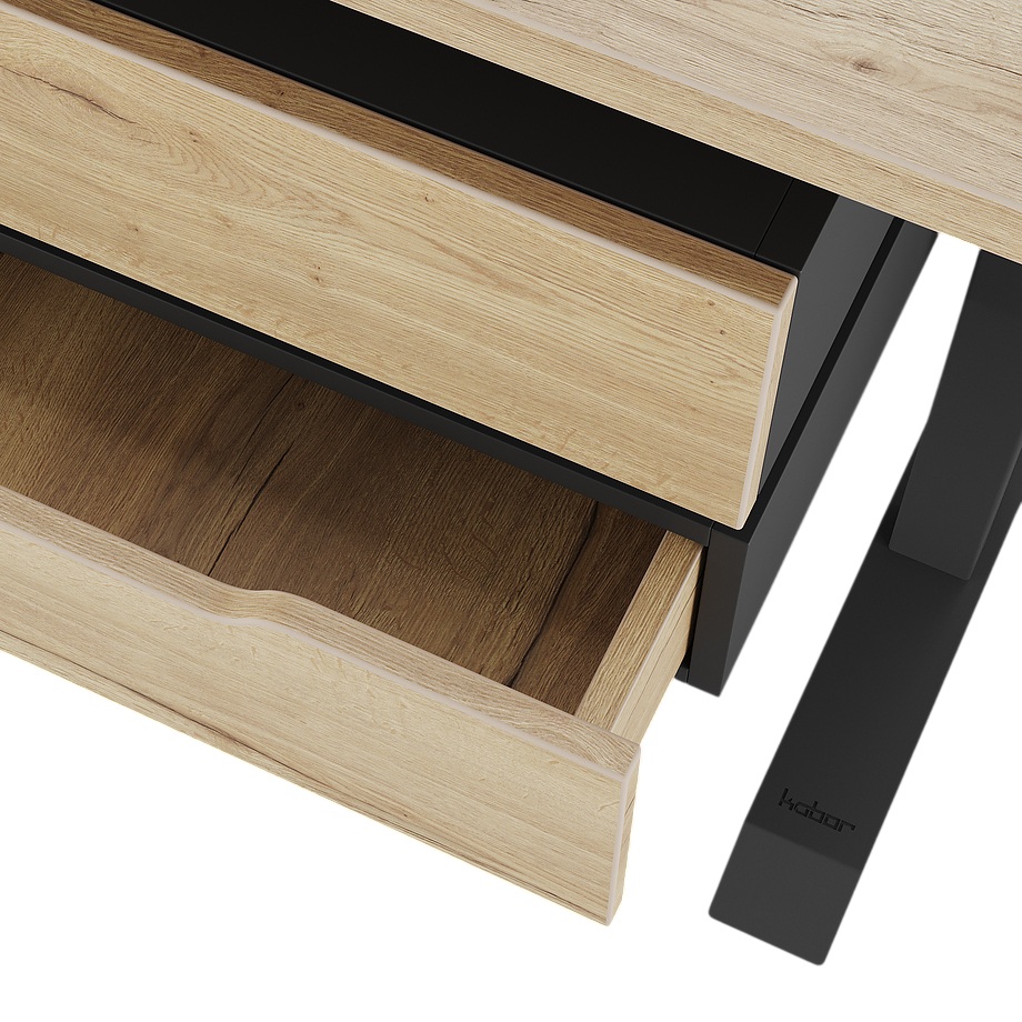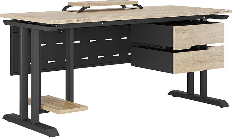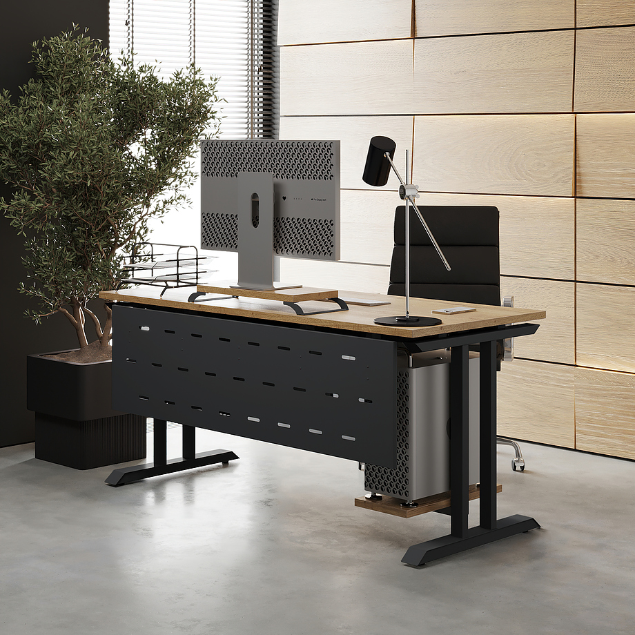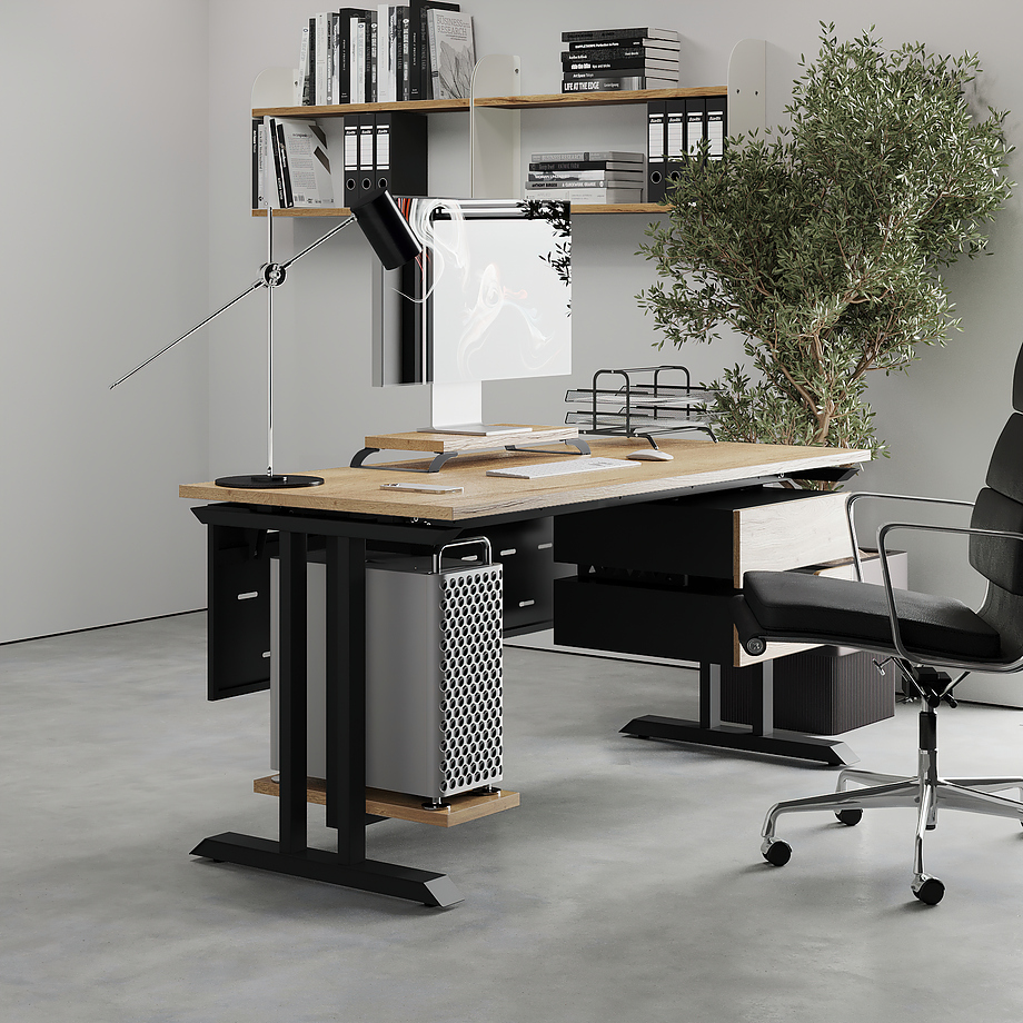 Офисный стол КОБОР T-120/60 black/natural используется в офисных помещениях и кабинетах руководителей. Модель оснащена Т-образными опорами. Материал столешницы - прочный ЛДСП толщиной 25 мм, усиленная снизу металлическим каркасом, материал опор - окрашенный металл.