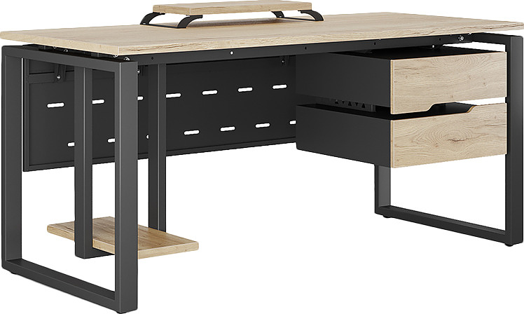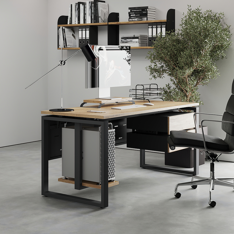 Офисный стол КОБОР O1-140/70 black/natural используется в офисных помещениях и кабинетах руководителей. Модель оснащена О-образными опорами. Материал столешницы - прочный ЛДСП толщиной 25 мм, усиленная снизу металлическим каркасом, материал опор - окрашенный металл.