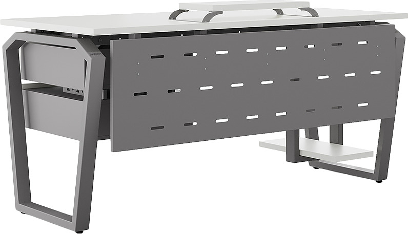 Офисный стол КОБОР TB-120/60 aluminum/premium используется в офисных помещениях и кабинетах руководителей. Конструкция модели включает опоры, выполненные в виде перевернутой трапеции со скошенными верхними углами. Материал столешницы - прочный ЛДСП толщиной 25 мм, усиленная снизу металлическим каркасом, материал опор - окрашенный металл.