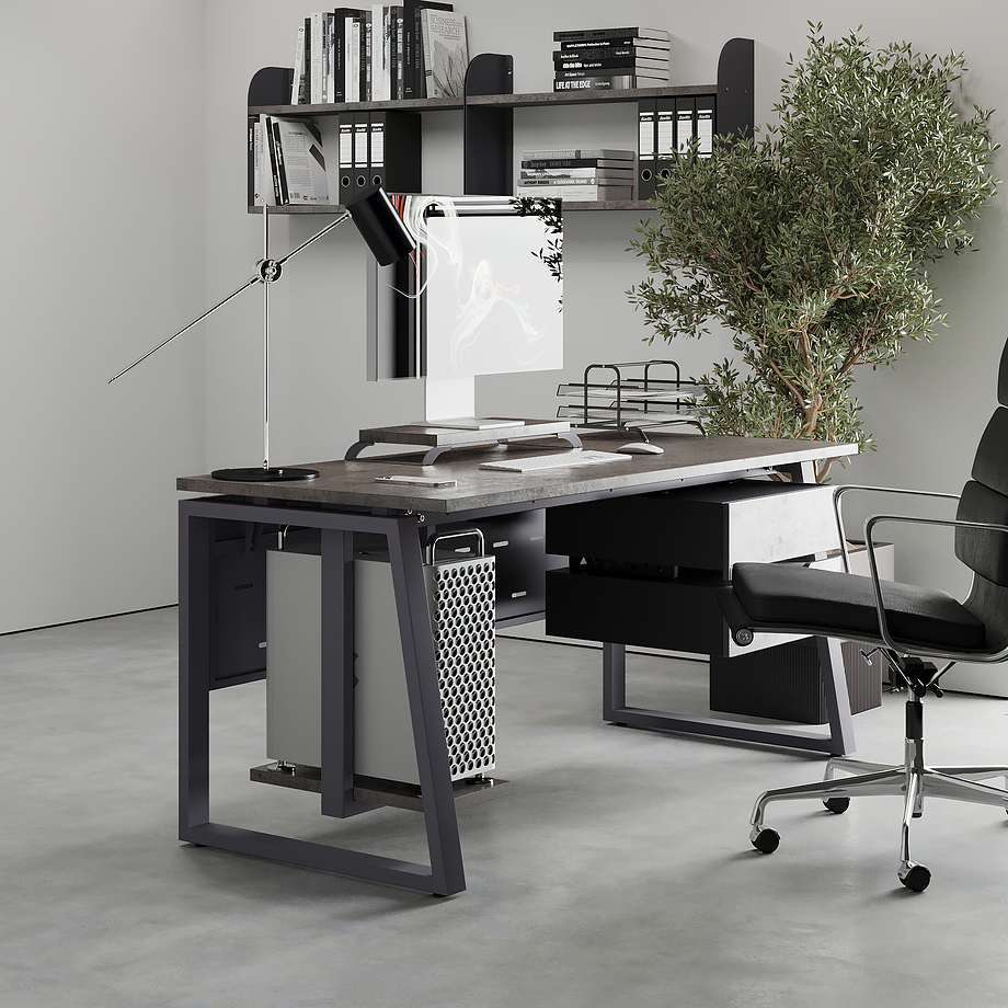 Офисный стол КОБОР TS1-120/60 graphite/chicago используется в офисных помещениях и кабинетах руководителей. Модель оснащена опорами в форме наклонной трапеции. Материал столешницы - прочный ЛДСП толщиной 25 мм, усиленная снизу металлическим каркасом, материал опор - окрашенный металл.
