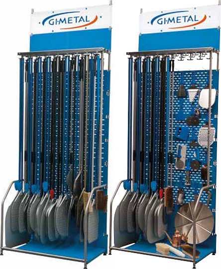 Стенд GiMetal ES1 предназначается для предпродажной демонстрации инвентаря для пиццы. 3 ряда 2-х уровневых крючков для навесных предметов, перфорированная стенка с возможностью размещения дополнительных крючков, сплошная полка внизу. Изделие установлено на 4 опоры.