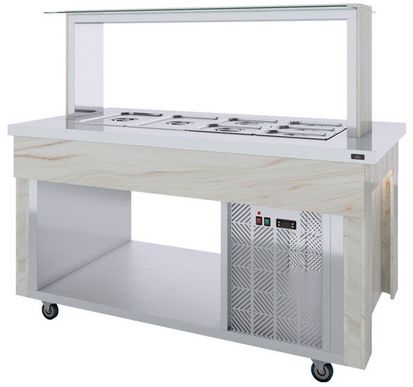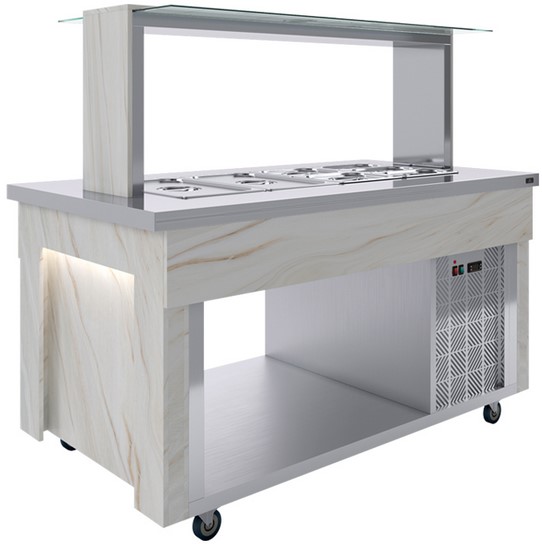 Салат-бар Luxstahl СБ-1500 Premium используется для демонстрационной подачи, кратковременного хранения и охлаждения салатов и холодных закусок в составе линий раздачи или самообслуживания на предприятиях общественного питания, торговли и пищевых производствах. Модель оснащена полкой и колесами для передвижения со стопорами. Материал изделия - высококачественная нержавеющая сталь.