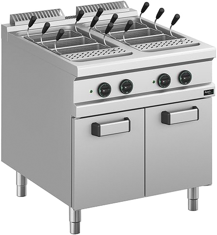 Макароноварка Apach APPE-89P/PL 900-й серии используется на предприятиях общественного питания и торговли для приготовления спагетти, пасты и прочих изделий из теста. Модель оснащена закрытым шкафом с 2 распашными дверцами и электромеханической панелью управления с 2 терморегуляторами, 2 таймерами и 4 световыми индикаторами. Корпус, рабочая поверхность, панель управления и вытяжная решетка выполнены из нержавеющей стали AISI 304, дверцы, боковые и задние панели - из нержавеющей стали AISI 430, ванна - из нержавеющей стали AISI 316.