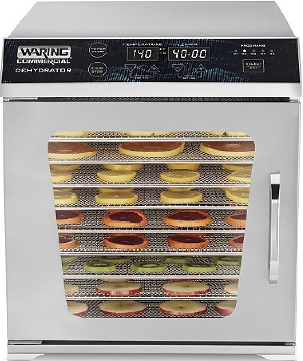 Дегидратор Waring WDH10E используется на предприятиях общественного питания, торговли и пищевых производствах для сушки овощей и фруктов. Модель оснащена электронным управлением, таймером, направляющими и распашной дверцей. Материал корпуса и сетки - высококачественная нержавеющая сталь, материал дверцы - закаленное стекло.