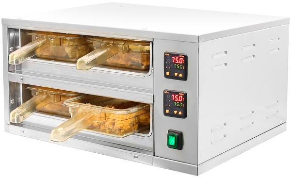 Тепловой шкаф RoboLabs МН-2-2М-01 предназначен для поддержания горячей температуры бургеров, мясных и рыбных блюд, соусов, пюре и пасты на предприятиях общественного питания. Модель оснащена 2 изолированными отсеками. Корпус выполнен из нержавеющей стали AISI 430.