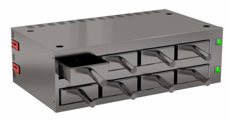 Мультихолдер (чикен-кабинет) КАМИК ШТ-340391 используется на предприятиях общественного питания, торговли и пищевых производствах для поддержания готовых вторых блюд в горячем состоянии. Модель оснащена электронной регулировкой температуры на каждый уровень и 2 уровнями на 4 совка. Материал корпуса - высококачественная нержавеющая сталь AISI 430.