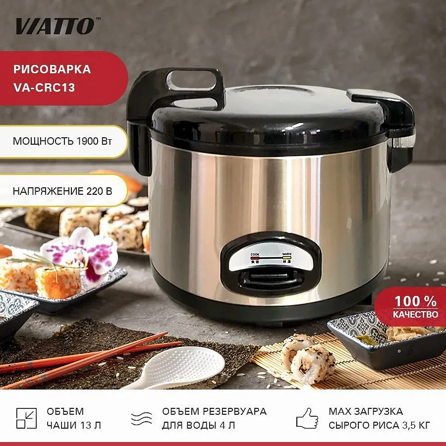 Рисоварка VIATTO VA-CRC13 предназначается для варки и поддержания температурного режим риса и прочих круп на предприятиях общественного питания, торговли и пищевых производствах. Автоматический переход в режим поддержания риса в разогретом состоянии по окончании готовки. Равномерный нагрев позволяет приготовить большое количество риса, не повреждая его структуру. Материал корпуса - нержавеющая сталь, материал чаши - алюминиевый сплав с антипригарным покрытием, материал ручек - безопасный термоизоляционный материал.