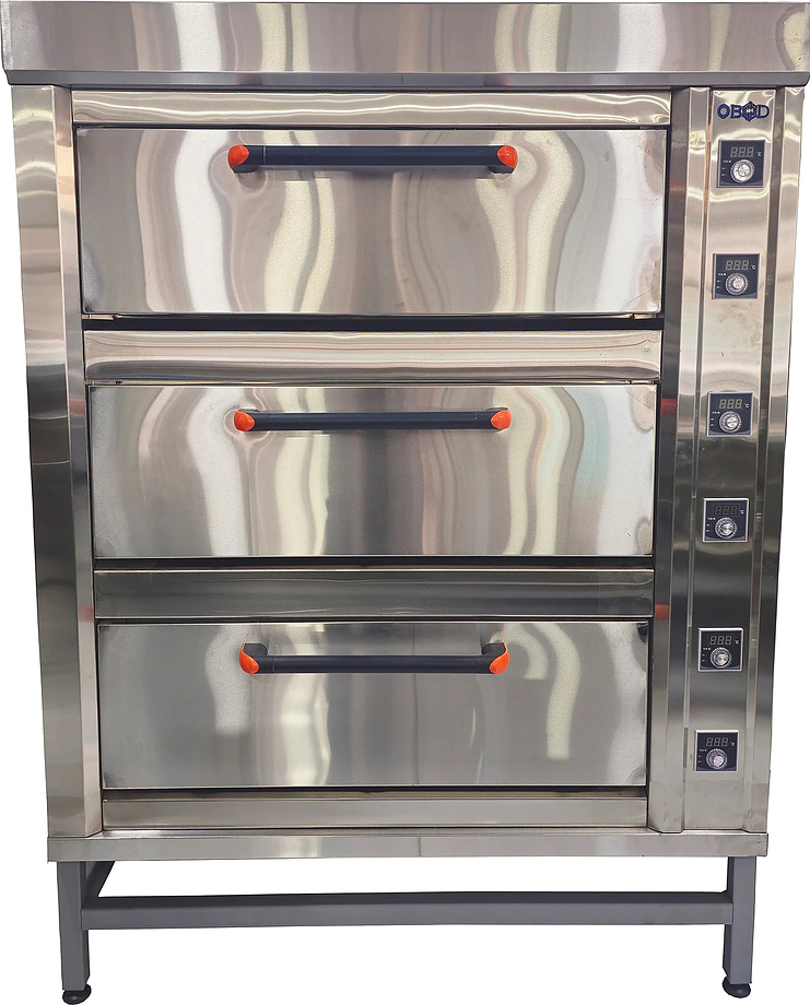 Духовой шкаф OBOD/3 уровня предназначена для приготовления различных блюд и выпечки хлебобулочных и кондитерских изделий на предприятиях общественного питания, торговли и пищевых производствах. Модель оборудована электромеханическим управлением, регулировкой температуры, 2 термостатами для каждой камеры, жаропрочным стеклом и внутренней подсветкой. Материал подов - углеродистая сталь толщиной 3 мм, материал дверц - высококачественная нержавеющая сталь, материал ТЭН - нержавеющая сталь AISI 304.
